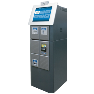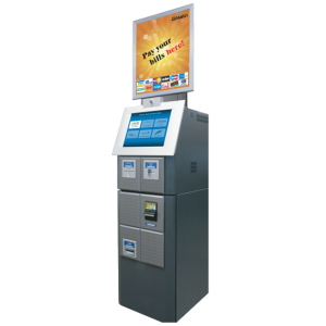 Genmega GK1000 Bill Payment Kiosk with TIO Bill Payment Solution. Touch screen Color LCD, Magnetic Card Reader, Receipt Printer, Bill Acceptor, and High Brightness Topper.